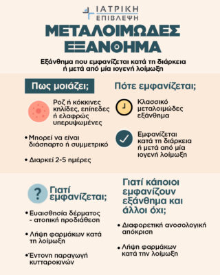 Το μεταλοιμώδες εξάνθημα αποτελεί μια συχνή, καλοήθη και αυτοπεριοριζόμενη δερματική εκδήλωση που μπορεί να εμφανιστεί τόσο μετά όσο και κατά τη διάρκεια μιας ιογενούς λοίμωξης. Παρότι συχνά ανησυχεί τους γονείς ή τους ίδιους τους ασθενείς, στις περισσότερες περιπτώσεις δεν υποδηλώνει κάτι σοβαρό και υποχωρεί χωρίς ειδική θεραπεία. Η σωστή ενημέρωση και η διάκριση από πιο σοβαρά εξανθήματα είναι κρίσιμες για την αποφυγή άσκοπων ανησυχιών και τη στοχευμένη αντιμετώπιση. Σε κάθε περίπτωση, η κλινική εκτίμηση από επαγγελματία υγείας παραμένει το ασφαλέστερο βήμα όταν υπάρχει αμφιβολία.