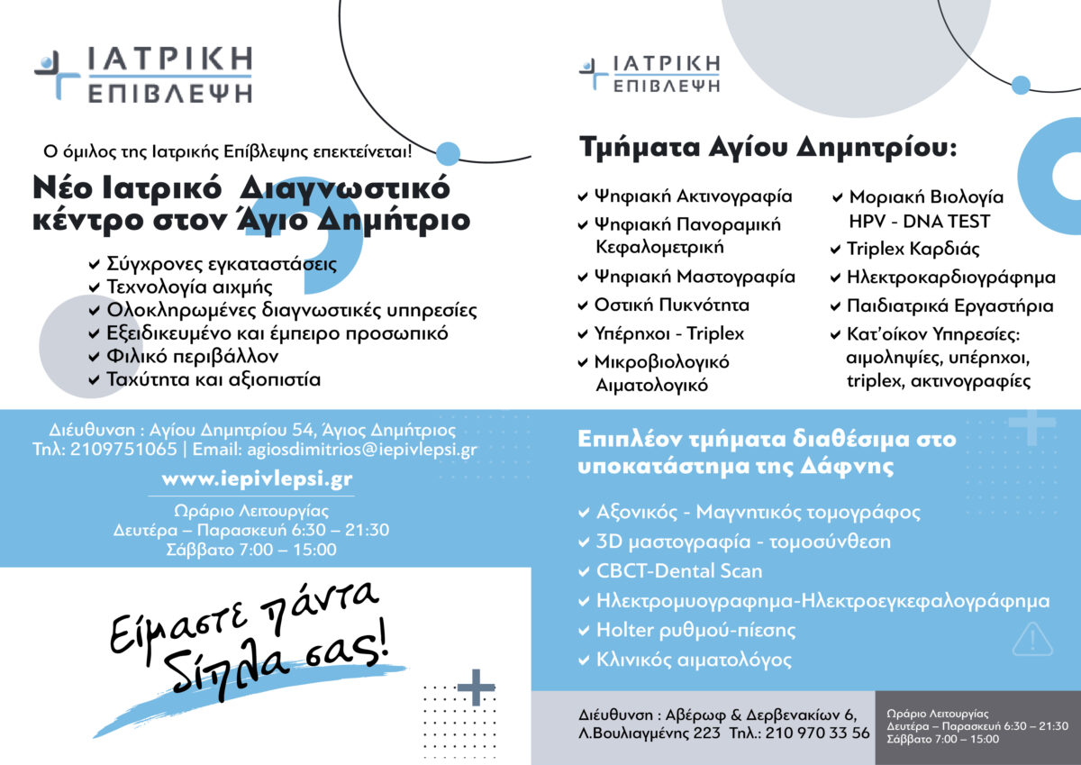 Πριν από δέκα χρόνια, ανοίξαμε για πρώτη φορά τις πόρτες της Ιατρικής Επίβλεψης, με σκοπό να προσφέρουμε ιατρικές υπηρεσίες υψηλής ποιότητας. Για να το πετύχουμε, επενδύσαμε στην υψηλή τεχνολογία, την καινοτομία, την άριστη επιστημονική κατάρτιση, την οργάνωση και την εκπαίδευση του προσωπικού μας, στοιχεία, τα οποία μας καθιέρωσαν ως ένα από τα πλέον σύγχρονα και αξιόπιστα ιατρικά διαγνωστικά κέντρα της Ελλάδος.